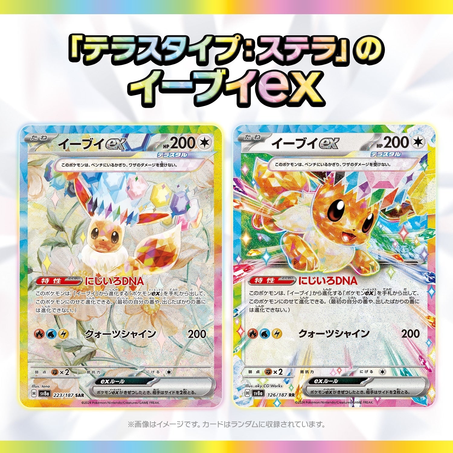 Radiant crystals burst in a festival of colors. From the shimmering lights, Umbreon ex SAR emerges in shadowy grace, joined by Sylveon ex, Leafeon ex, and legendary Terastal Pokémon unleashing their dazzling might in the Pokémon TCG: Terastal Festival ex High Class Pack! Each Terastal Festival Booster Box includes: